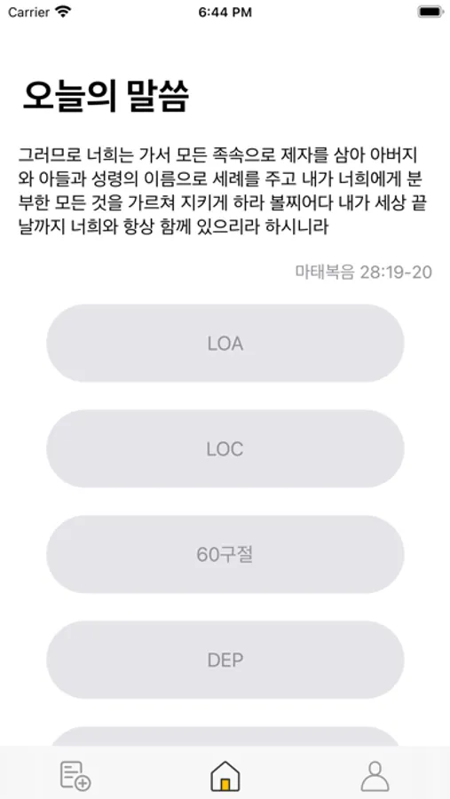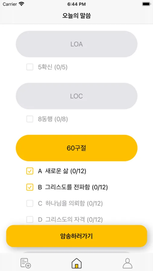 5확신, 8동행, 60구절, DEP, 180구절 말씀을 암송하고, 체크할 수 있습니다.