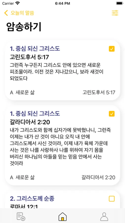 주제별 암송 카드 외에 암송하고 싶은 성경 구절을 등록하여 사용할 수 있습니다.