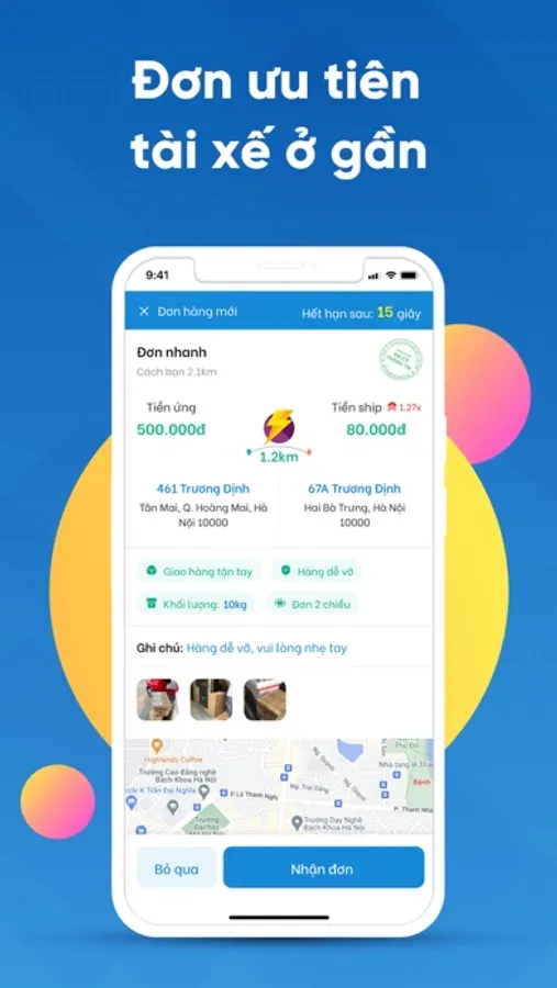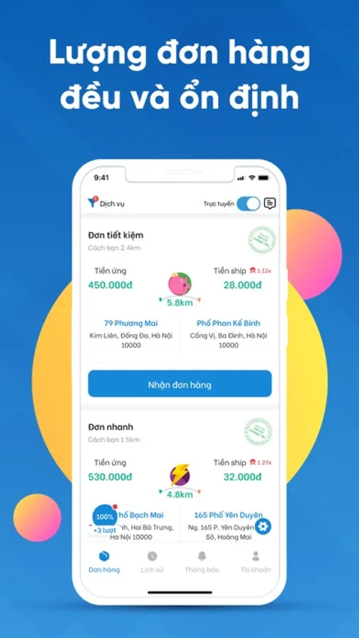 - Tài xế gần nhất nhận đơn, lấy hàng trong 10 phút và giao hàng trong 20 phút