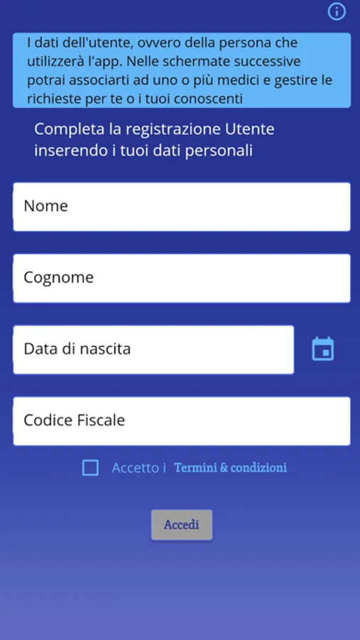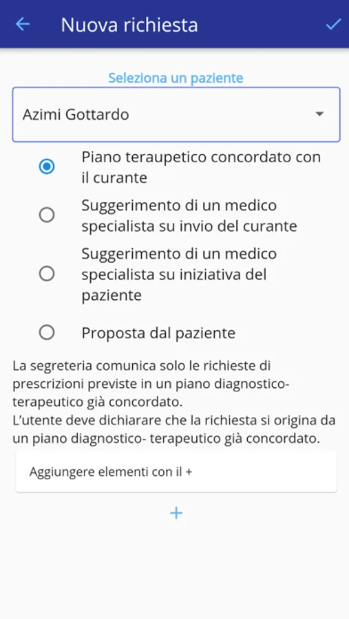 Una volta registrato l’utente potrà collegarsi al medico curante quindi ad uno o più pazienti compreso lui stesso. L’utente può gestire richieste per pazienti di medici diversi.