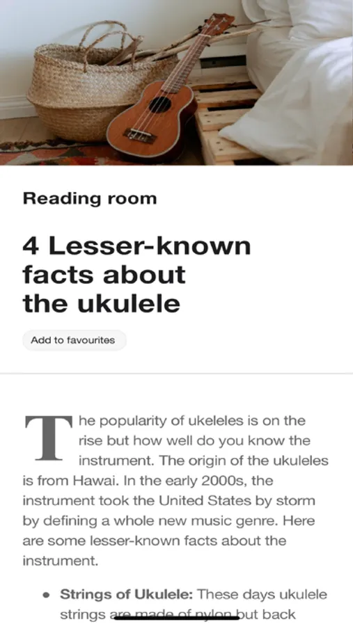 Explore your interest in music and songs with the lessons in our Learn to Play Ukulele app. Check out tutorials to learn and practice the art of playing music on your ukulele. From the basics of using a tuner and reading tabs to advanced lessons on how to play whole songs, know and learn everything about the ukulele with our app. Now pick up your ukulele, let’s learn some music at home!