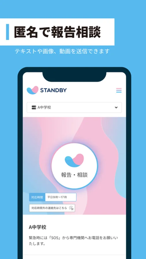 STANDBY (スタンドバイ) は学校や企業、または公共機関など様々な組織やコミュニティに属するひとりひとりが匿名で報告相談することができるアプリです。