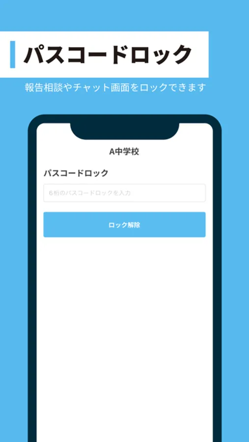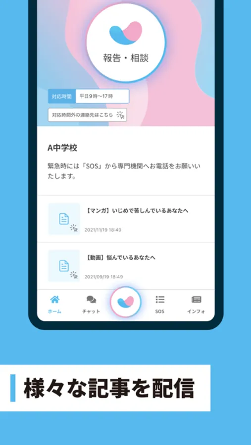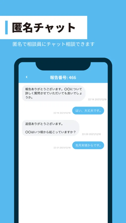 所属組織から配布されたアクセスコードを登録し、所属組織 (学校や企業、専門の相談窓口など) の管理者に簡単に匿名で報告相談をすることができます。報告相談にはテキストや写真、動画を含めることができます。