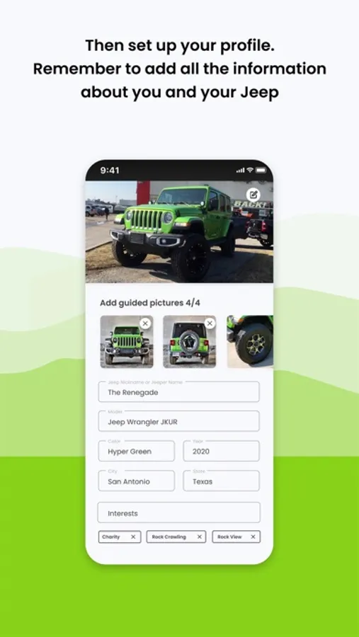 Add a picture of your favorite jeep with all the information that comes with it, such as model, color, year, the city where you bought it, and what interest you