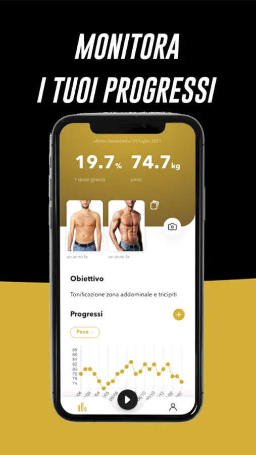 Avrai sempre sotto controllo la tua attività fisica: potrai visualizzare quali esercizi sono previsti nel tuo piano di allenamento, i tuoi progressi e come cambia il tuo fisico nel corso del tempo.