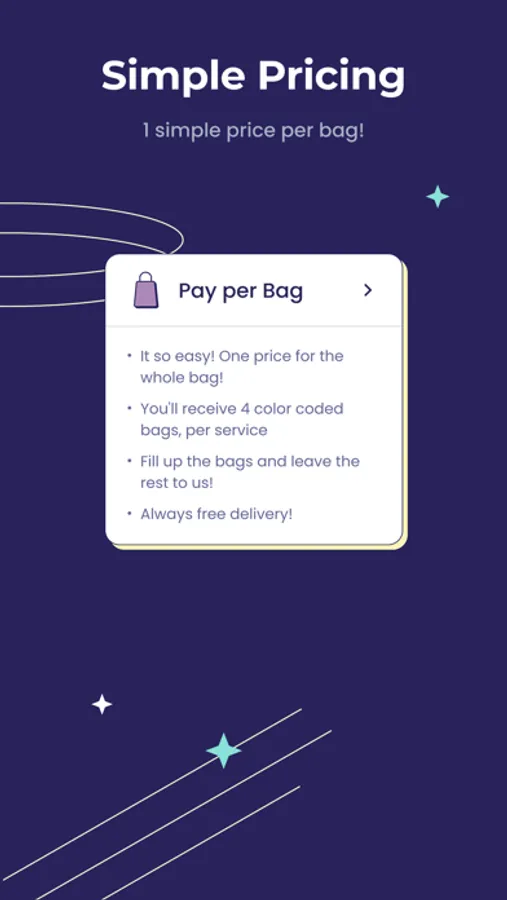 Fill a bag with your items and we will take care of the rest! We will return them to you cleaned, pressed or folded and smelling fresh! We have a single price per bag and no hidden cost! (Hence: Free delivery for you!)