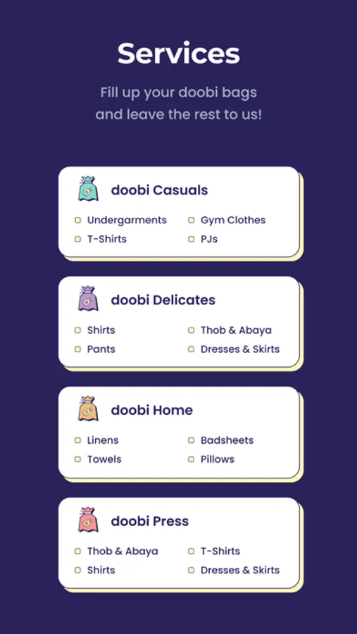 doobi is a digital mobile only laundry and dry cleaning platform. Designed to provide a fun and easy laundry experience. Simply, pick a plan, fill a bag and leave the rest to us!
