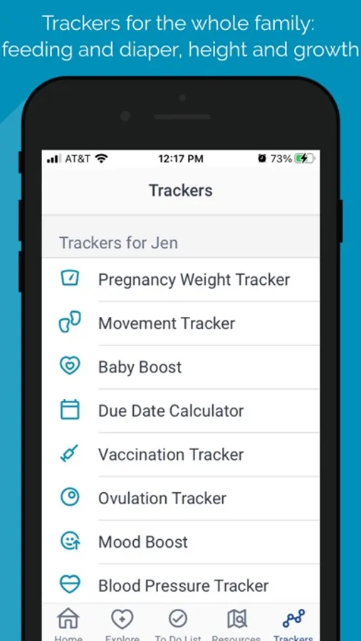 • Pregnancy trackers for baby’s kicks, your healthy weight gain and due date
