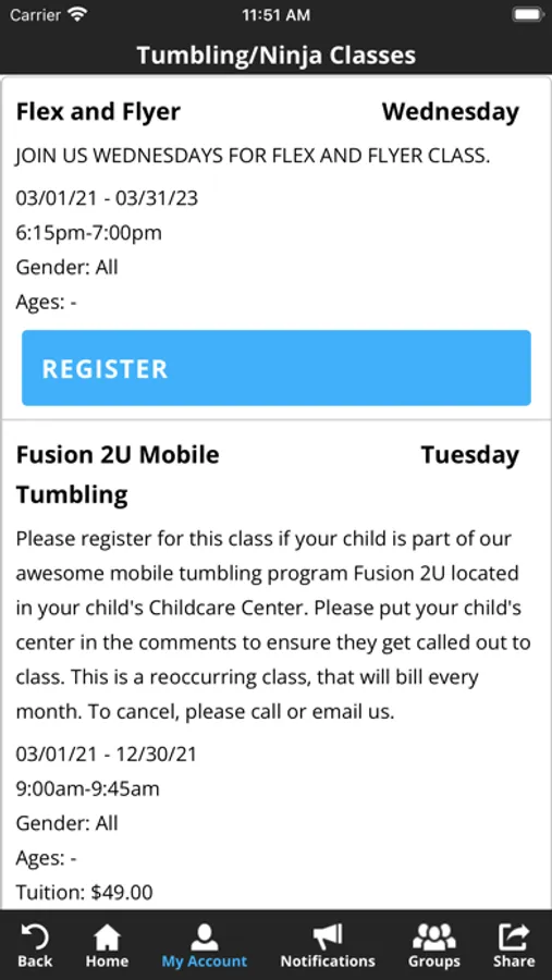 The Fusion Athletics app allows you to manage your account with ease, register for classes, parties, and special events. You'll also receive important notifications about class changes, closings, registration openings, special announcements, and upcoming events.