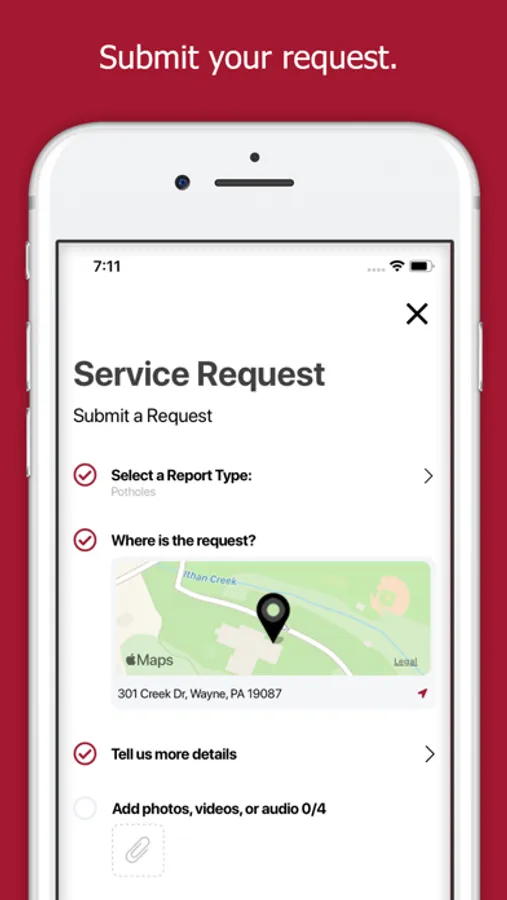 Whether you live, work, visit or play in Radnor, this free, easy-to-use app allows you to submit service requests for code violations, potholes, streetlight outages, unsafe conditions and more directly from your mobile device. Service requests are routed to the appropriate department for attention and will be responded to quickly and efficiently, and you’ll be notified when they are resolved.