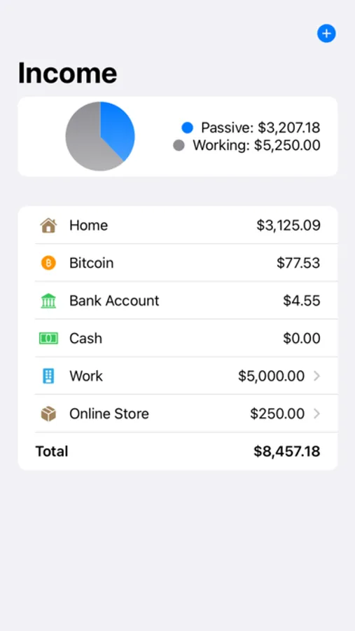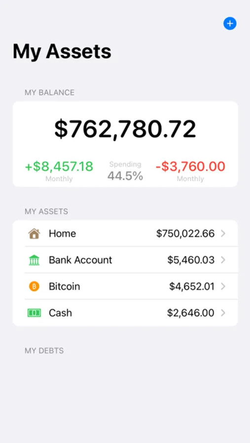 Track your money going in and out, with this simple birds-eye-view of your finances. Keep your assets, debts, income, and expenses organized in the My Assets app. Then customize each record with a unique symbol. See your money growing in realtime!
