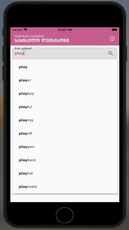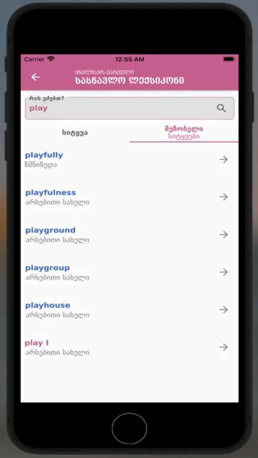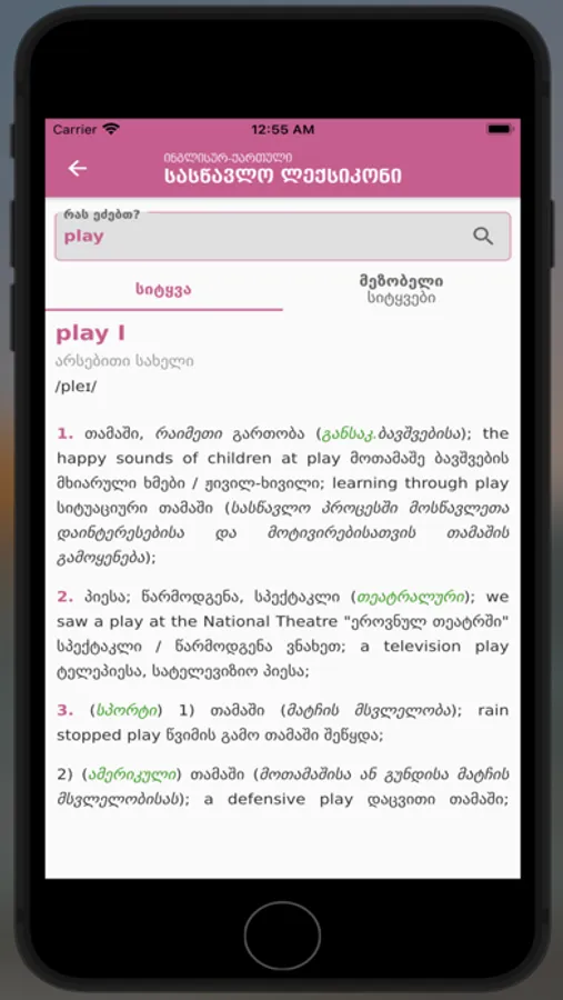 English-Georgian Learner's Dictionary comprises 30,000 the most frequently used words of the Modern English Language. The selection of polysemous meanings of words, phrasal verbs, and idioms is also based on the frequency principle