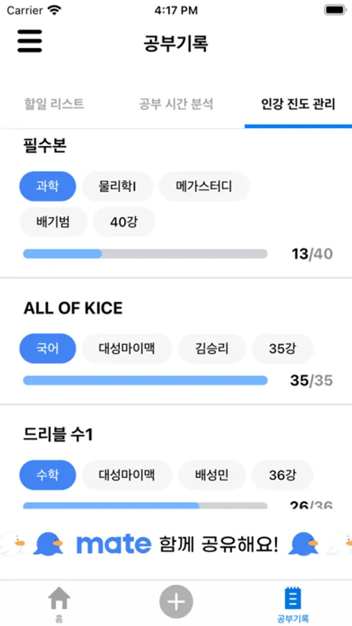 ● 과목별, 강사별, 사이트별로 인강 진도를 관리하세요