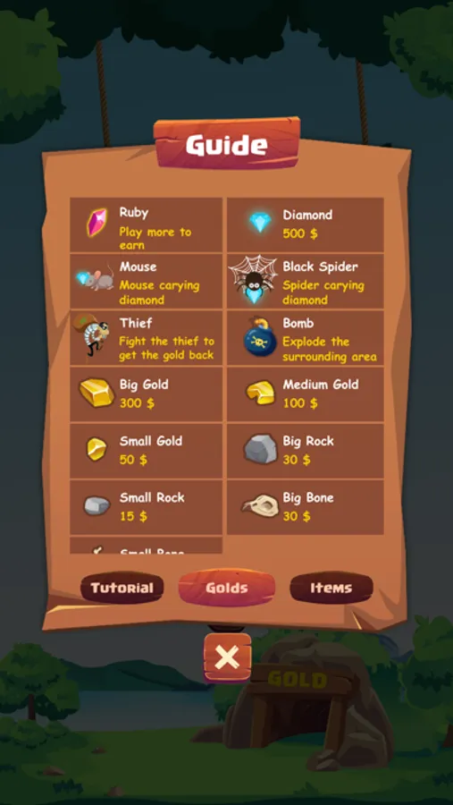 - Diverse items: Gold, Diamond, Gold Thief, Poison Spider, Mouse, Stone, Dinosaur Bone...