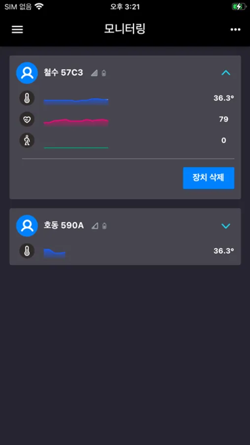 등록된 기기는 실시간 차트를 통해 체온을 모니터링 할 수 있으며, 설정을 통해 체온 초과 알람 등의 출력이 가능합니다.