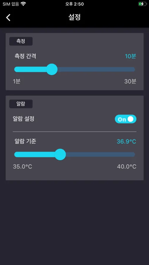 데이터 측정 수집 간격과 체온 알람 간격을 조절하세요.