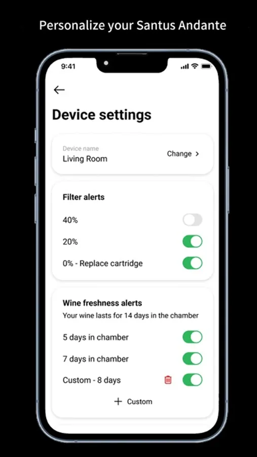Connect your Santus to your home Wi-Fi and receive notification about the status of your wine and machine anywhere you are. Personalize your Santus and receive wine promotions depending on your region !