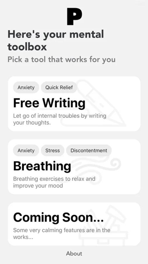 PeaceBox is like a toolbox for your mind with everything you need to let go of your worries. In PeaceBox you'll find tools like breathing patterns to help you calm down and journaling to help you let go of inner conflicts with much more planned to come!