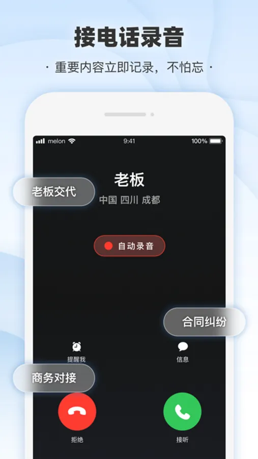 通过微微电话录音记录来电和去电的电话,帮您记录每次的通话内容,再也不用手忙脚乱了。