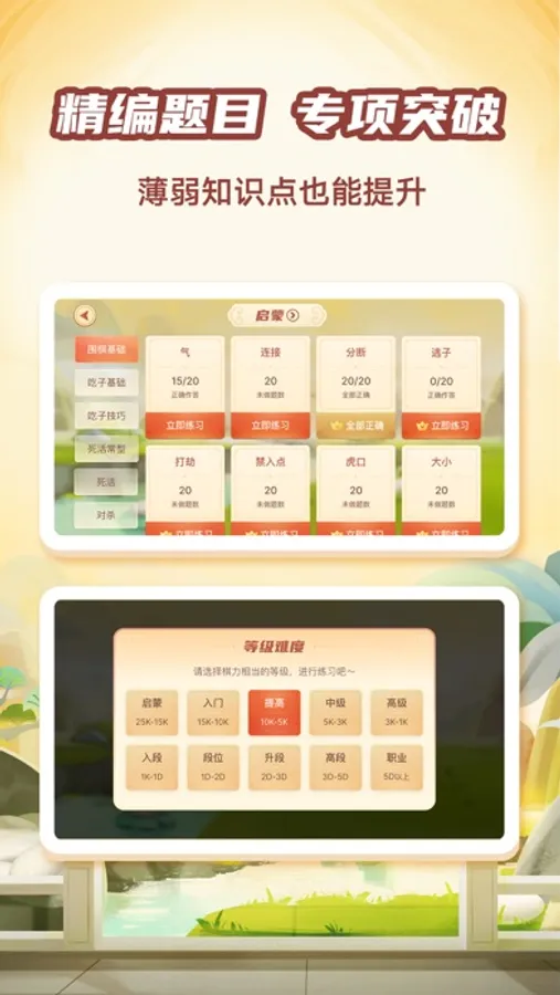 * AI复盘:通过复盘发现薄弱环节,查漏补缺,高效提升棋力。同时支持智能语音讲解复盘结果,适合初学者的AI复盘,更高效的提升棋力。