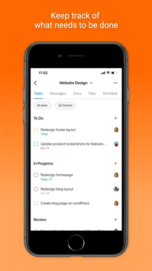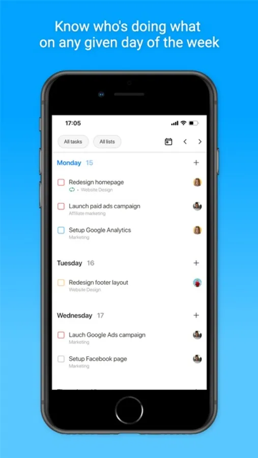 Schedule: Know at a glance who's doing what today, tomorrow, and any given day of the week.