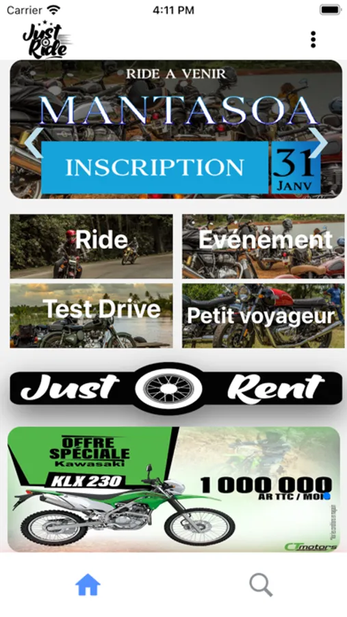 L’application Just Ride est l’outil idéal pour tous les utilisateurs de véhicule deux roues. Restez informé des événements, des futurs rides via des pop-up, la location des motos, les bons coins et les bonnes adresse via l’annuaire, regardez les derniers tests ride et promouvoir des marques.