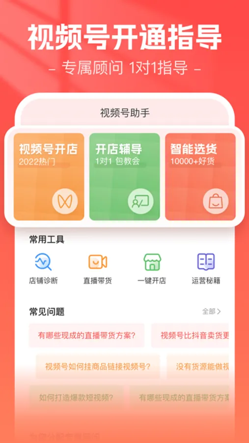 5年资深经验的开店顾问,一对一全程指导,帮你解决视频号开店遇到的问题,手把手教你微信开店、视频号带货、直播间涨粉,量身定制视频号增长方案