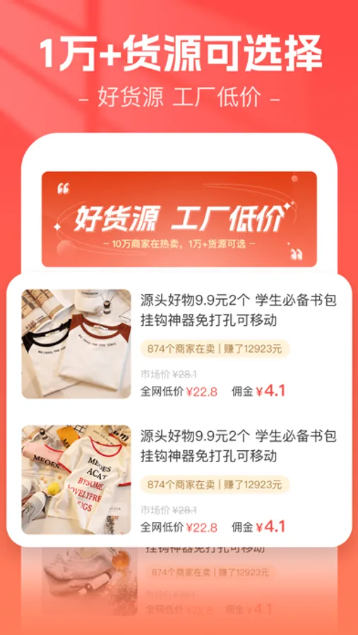 涵盖各平台热销商品,一手货源,让您可以获得和大主播同样的价格及佣金,通过短视频、直播带货轻松赚到钱。