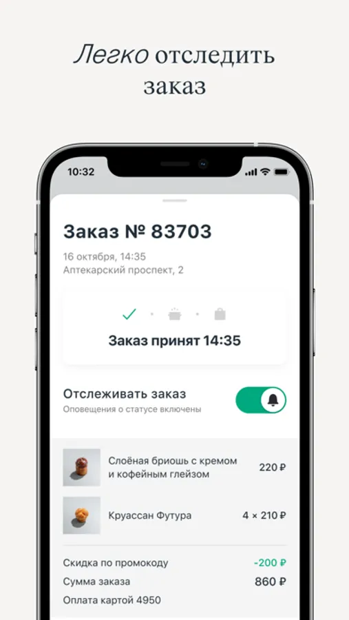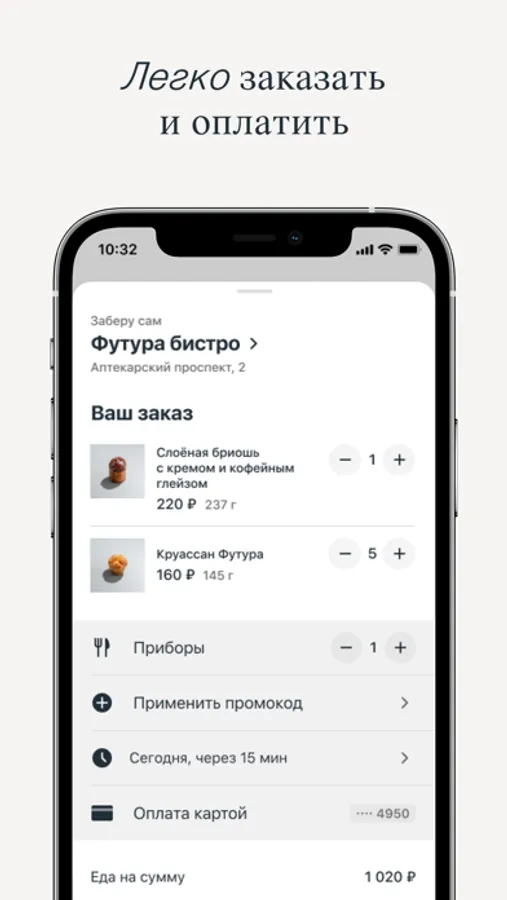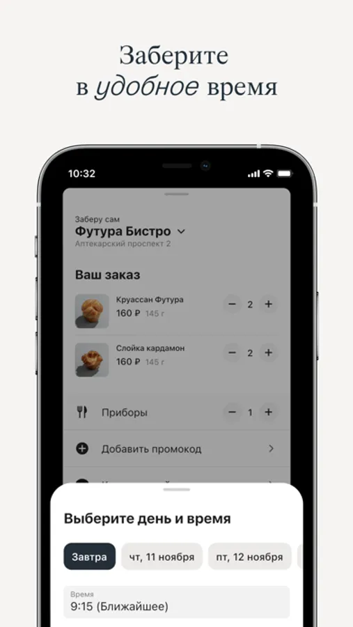 Вы можете заранее сделать заказ и прийти за ним в ФУТУРА бистро, пекарню или угол. Статус заказа подскажет приложение.