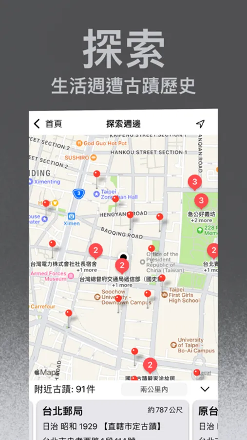 1. 探索週邊的古蹟:以手機GPS定位的方式進行探索。並可以依自己腳程或移動工具,選擇一公里、兩公里、三公里...等距離的物件清單。