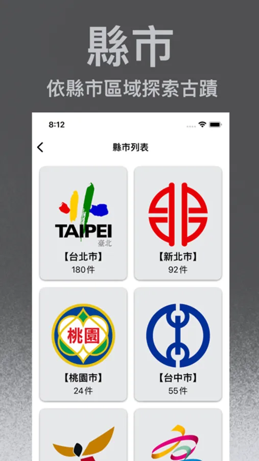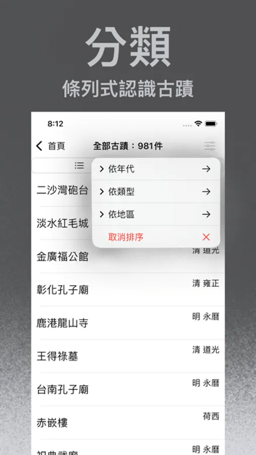 2. 查看全部的古蹟:可以依照古蹟的年代、功能、區域,不同的方式地毯式的查讀古蹟。