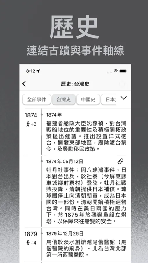 5. 重點歷史事件表:以台灣史為主軸,提供包括中國史、日本史、世界史等歷史條目。以該年度的政治、社會、文化的重點事件,配合該年度的落成的古蹟一併閱讀,加深古蹟的認識。