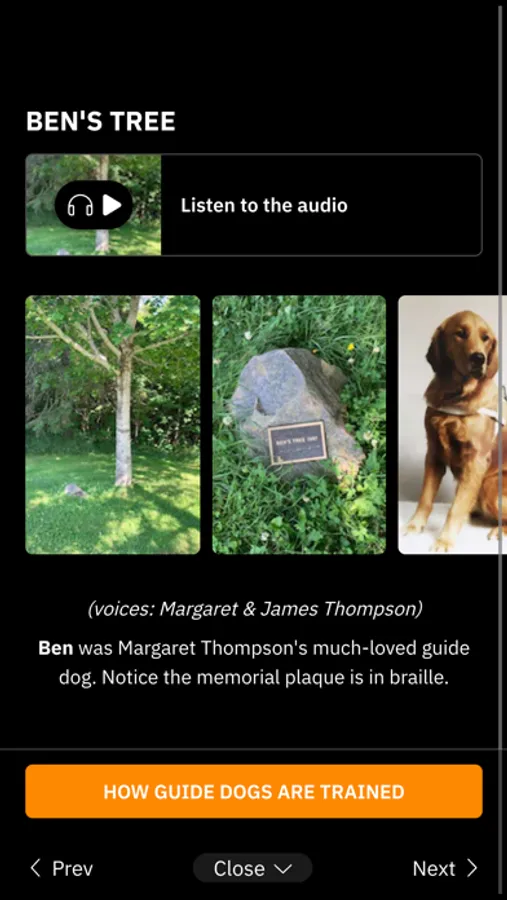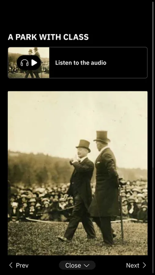 • When you're in the park, the app triggers automatically by GPS as you pass different locations. Voices whisper in your ear, while your smartphone shows photographs, maps and revealing details.
