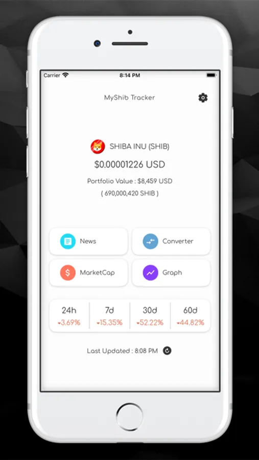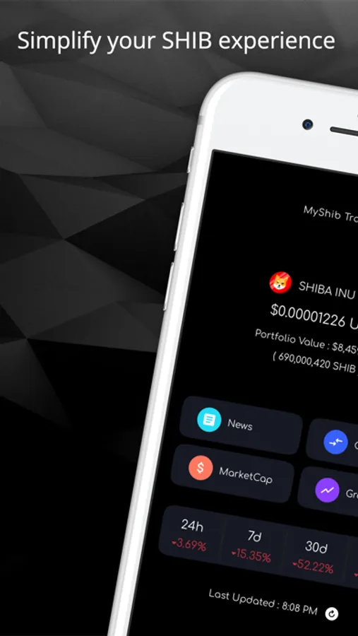 The Shiba Inu Coin Tracking app lets you easily view the price, and daily, weekly, monthly and 2 month percent change of the value of the SHIB Coin.