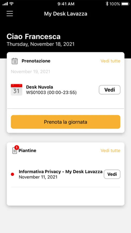Gestisci le prenotazioni della tua postazione di lavoro in maniera facile e veloce. Con MyDeskLavazza puoi visualizzare le postazioni disponibili nel tuo piano e prenotare la tua scrivania, pianificando le tue giornate di lavoro in Nuvola.