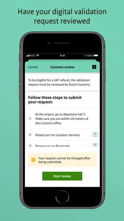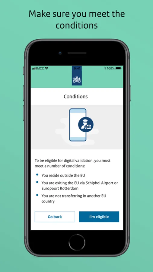 When you have arrived at the airport or port, this app will direct you to a specific location. There you can submit the validation request via the app. Dutch Customs will then check your validation request. There are 2 follow-up options. Either you will immediately receive an export validation, or you will be asked to have your purchases checked manually at the Customs office.