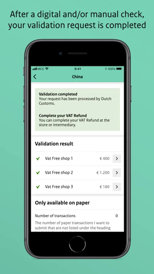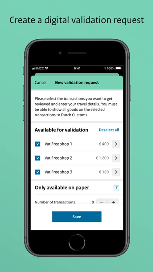 The electronic validation proces is in a pilot phase. You can only use this app if you depart from Amsterdam Airport Schiphol, Rotterdam P&O and Rotterdam Stena Line. Not all shops and intermediaries participate in this pilot. Transactions from shops and VAT Refund Operator that do not participate are not included in the app. You can present these transactions on paper at the Customs office.