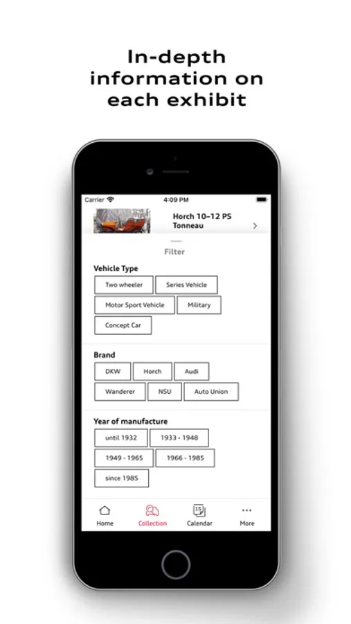 But even without a visit to the museum, our app offers you a lot of interesting content. Learn all you need to know about our historic models. More than a century of mobility history comes to life in your home and you can stay up to date on events related to the Audi museum mobile. Experience further online offers and get all the information as well as news about Audi Tradition. It's worth it!
