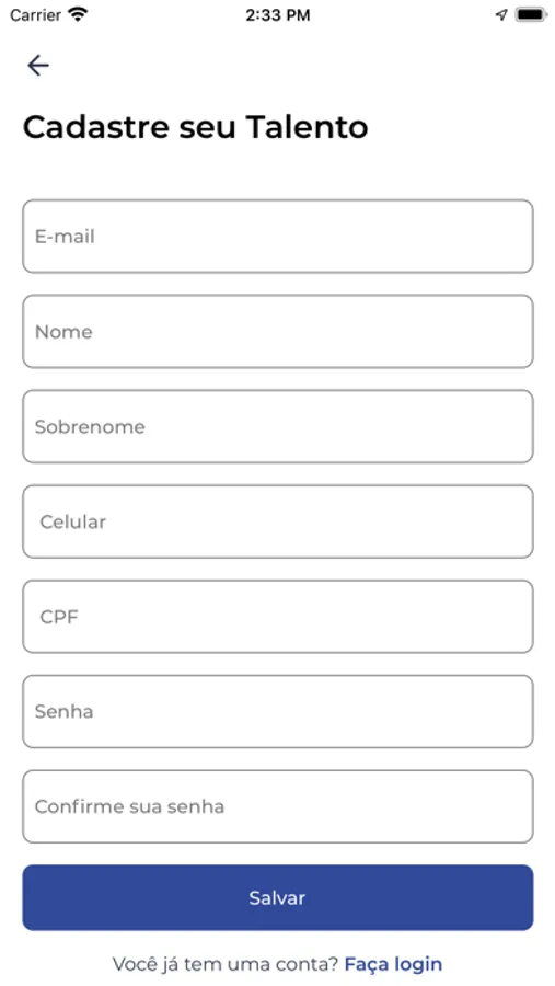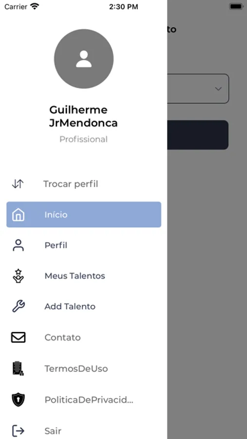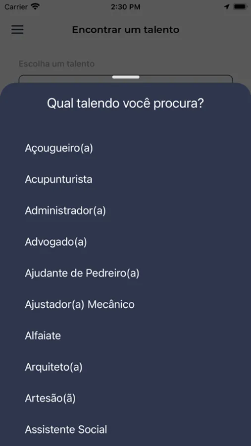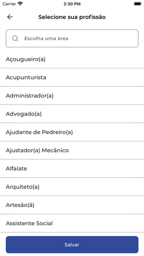 Para o perfil profissional, possuímos uma gama de profissões para se cadastrar e participar da procura dos usuários.