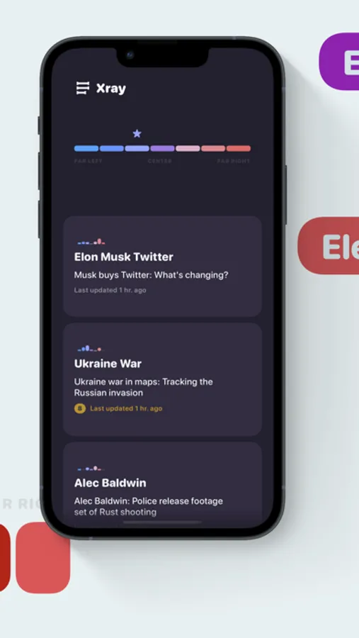 Xray scans the news and groups coverage of a subject in real time, without any human interference. Every story is color-coded and tagged according to its position on the U.S. political spectrum, making it easy to tell the underlying bias of everything you are reading.