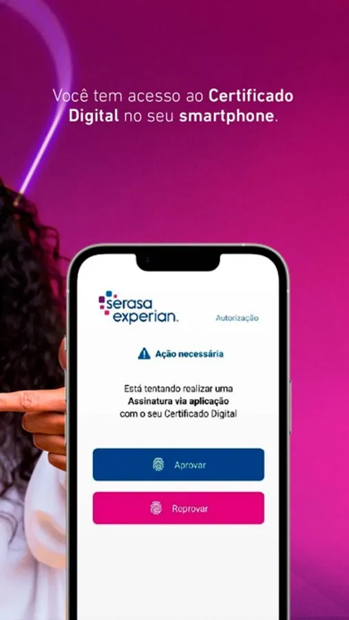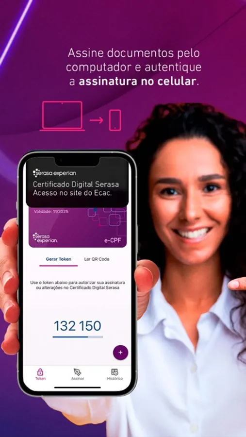 É simples. Você assina os documentos pelo computador e faz a autenticação da assinatura no celular, na palma da mão, de qualquer lugar.