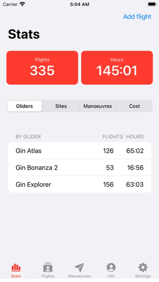 - Flights and hours per glider