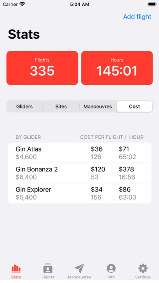 - Cost per flight/hour for each glider