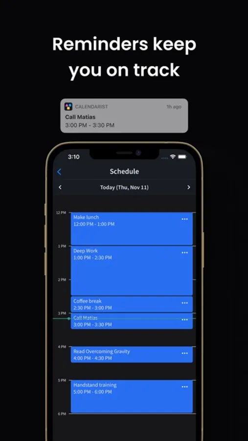 Calendarist is the simplest all-in-one time blocking and to-do list app. Plan your goals for the day by creating tasks, and set yourself up for success by scheduling them on your calendar! Events automatically get moved when conflicts appear, so all it takes is one tap to reschedule your entire day.