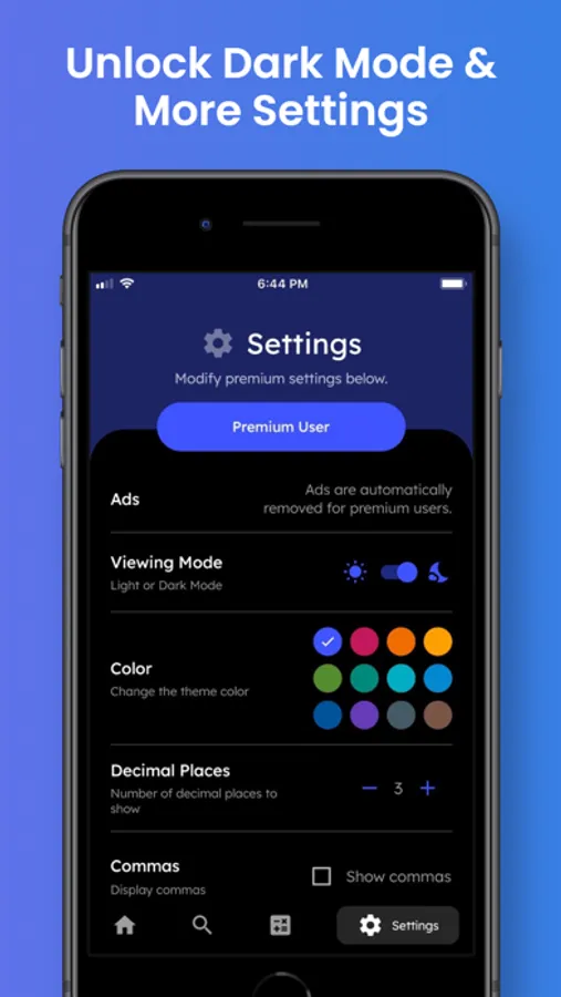 • Dark Mode • 12 Color Themes • Zoom • Custom Decimal Precision • Comma Display • No Ads