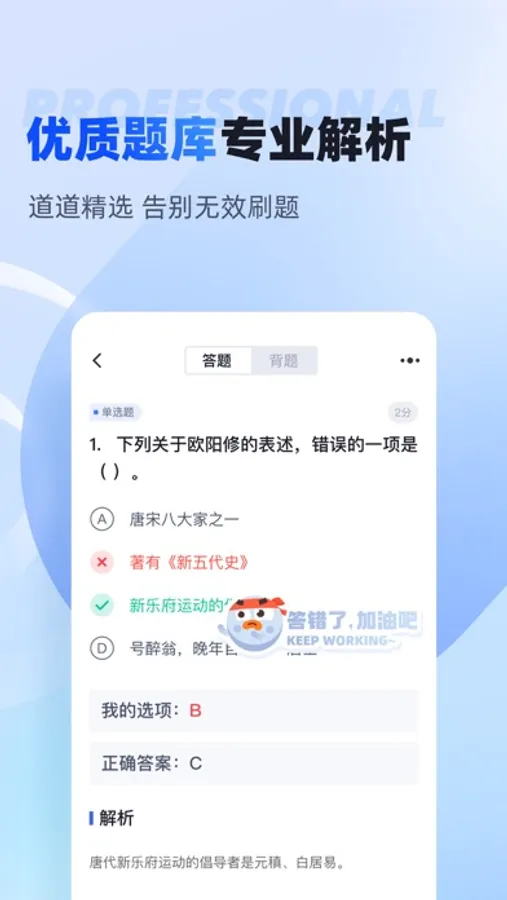 成人高考专升本题库内含考点练习,全国通用卷以及地区卷模拟练习,以及按照固定考试比重的随机式的抽题的真题考场,成绩单实时记录考试数据,一点一滴的反馈考生近期学习状态以及自我正确率的提升,大大的给予考生通过考试的信心。