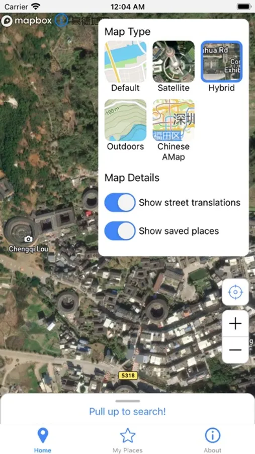 - View different map types including satellite imagery and the Chinese language Alibaba map