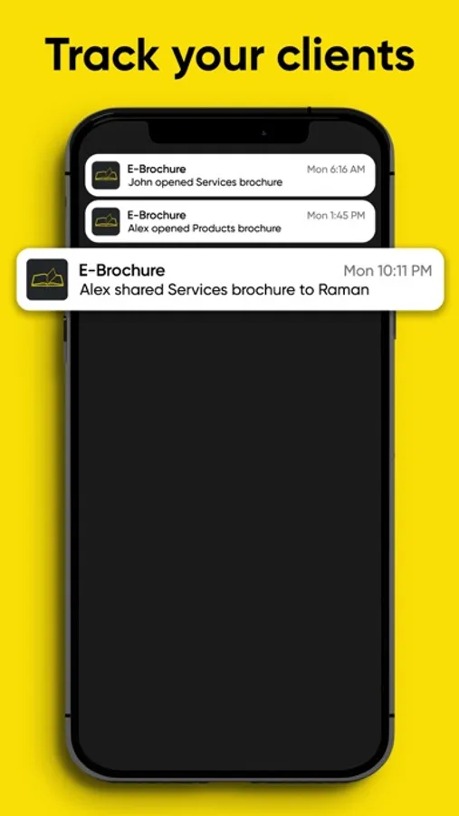 Every eBrochure created using our application gets its own URL, using the url you will be able to share the eBrochure to your clients. App also supports most advanced trackable share, i.e using this feature you can receive notification as soon as your client views your brochure, it will help your sales team to contact your client at the right time.
