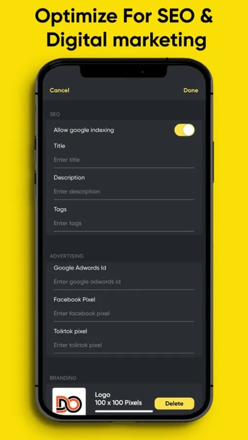 brochures made using eBrochure app are fully optimisable for SEO and digital marketing, you can configure title, description and keywords for your brochure according to your SEO optimisation, also you can enable or disable google indexing for your brochure. You can also configure google analytics id, Facebook pixel and TikTok pixel as well.