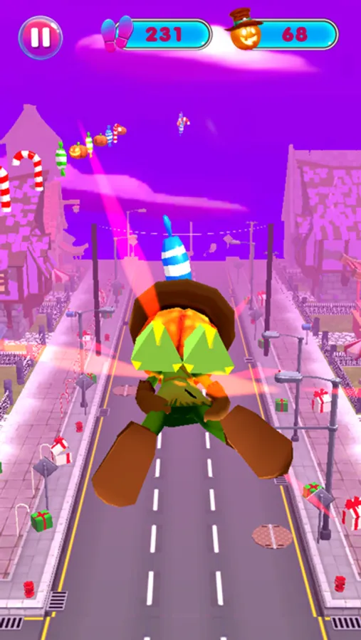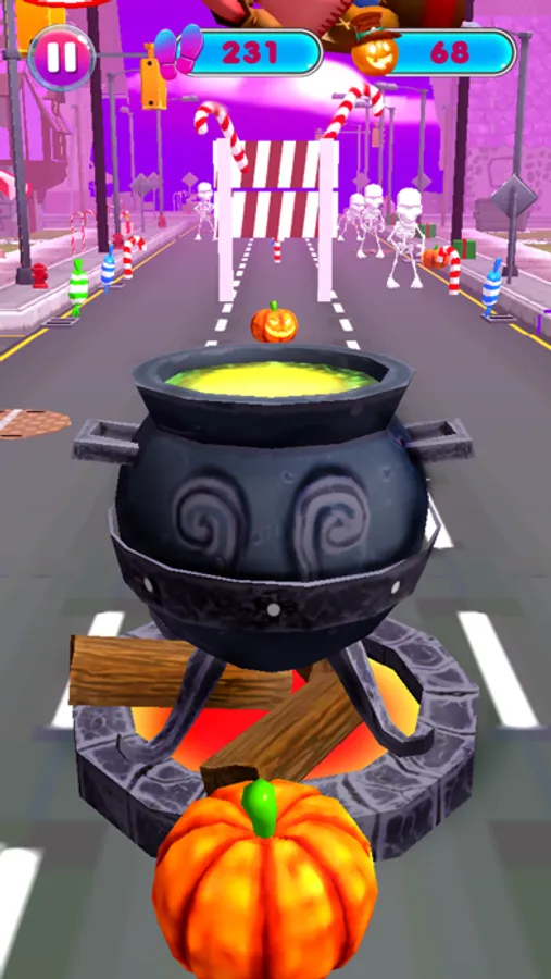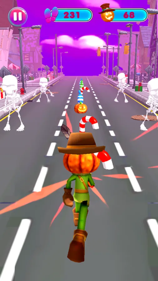 In exciting runner game, you can choose among 6 different characters to play with. Surf the Halloween night city with exciting Halloween dress up costume characters! Also, you can customize your virtual Halloween dress of choice by purchasing thematic runner skins!